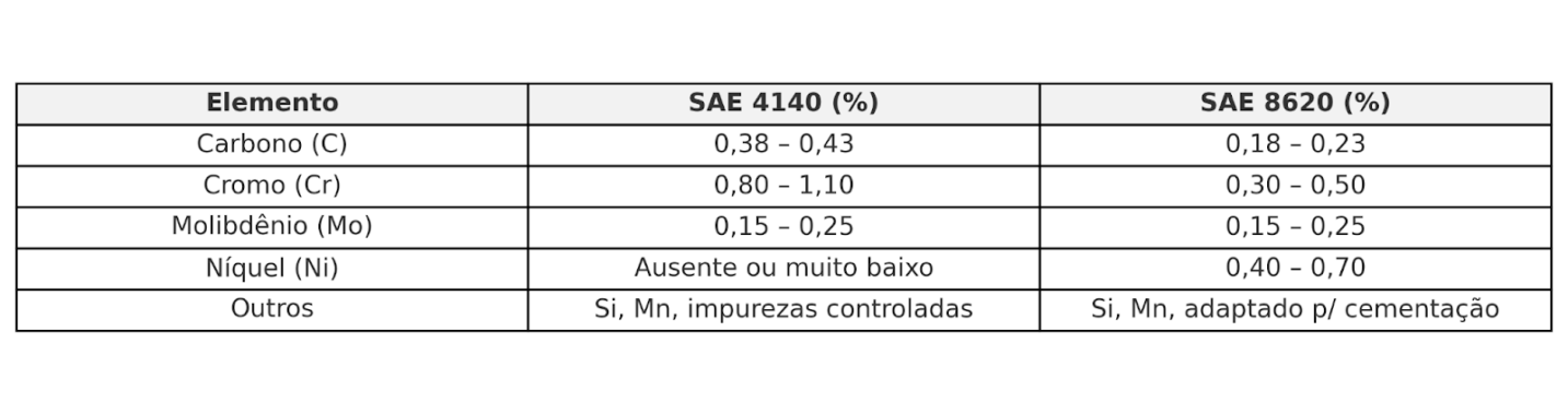 O SAE 4140, pois sua composição permite dureza elevada em toda a seção, sem depender exclusivamente de superfícies endurecidas. - O SAE 8620 é melhor para engrenagens carburadas do que o 4140?