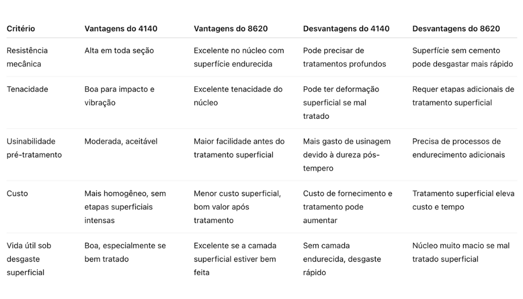 Em peças médias e quando se exige desempenho moderado, 4140 pode ser mais direto; em peças críticas com desgaste superficial, 8620 com camada endurecida proporciona vida útil superior compensando custo extra. - Qual requer menos manutenção ou substituição?